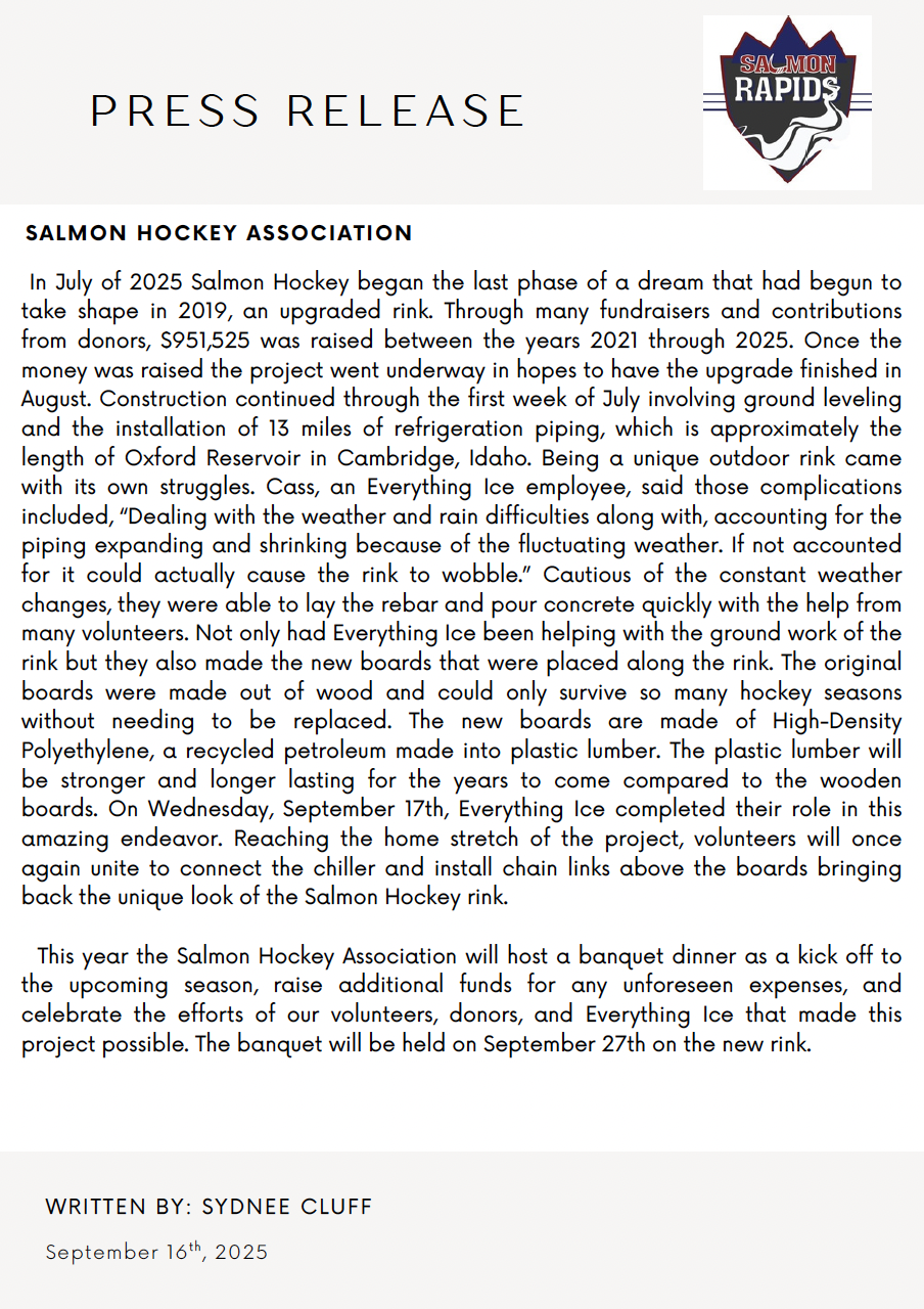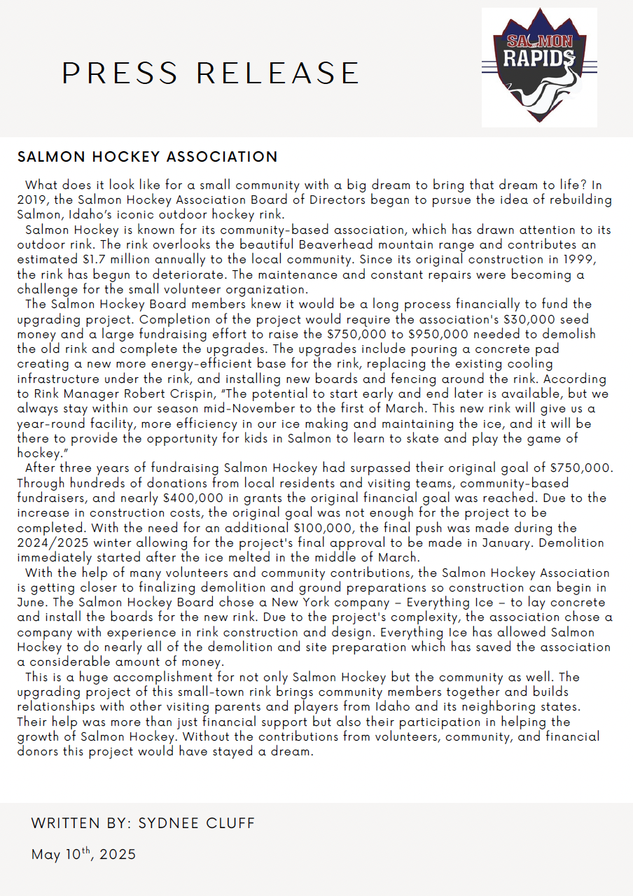The Salmon Hockey Association has impacted my personal and athletic development since I began my participation with the association in 2012. I wanted to find a way to incorporate my senior project with this association to give back to them and my community. My senior project was focused on assisting the association with public and media outreach during the reconstruction project. The goals of my senior project were to highlight its values to various news outlets, to keep the public informed of the project’s process throughout social media, and to create personalized thank-you cards for each of the donors who made this project possible with their contributions. My goals were accomplished by connecting with thirteen separate news outlets, of which at least six press releases were published, creating fourteen social media posts, and over seventy-five individual thank-you cards were generated and dispersed to donors. Through this endeavor, I have learned that the Salmon Hockey Association is well respected not only within our community but also within the state of Idaho. I would like to thank the association for allowing me to contribute to supporting and promoting Salmon Hockey.